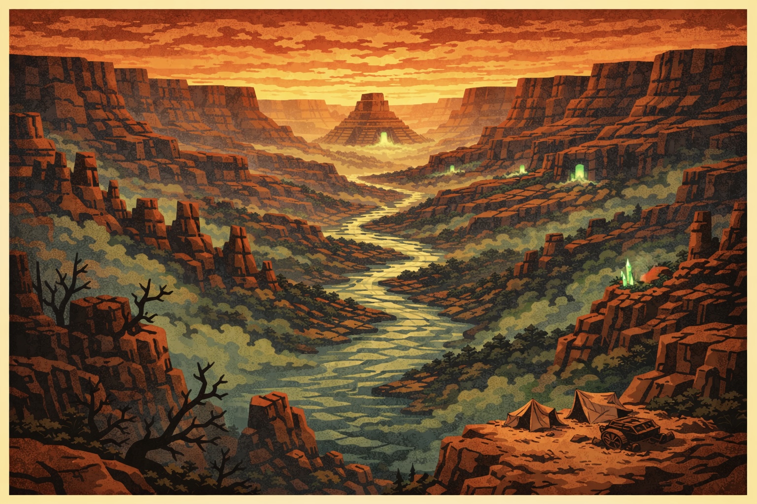 Now the canyon belongs to scavengers, bandits, desperate factions, and worse. Canyon pirates strip buildings for silver and scrap. Shrine Riders hunt relics under sacred oaths. Monsters stalk the ruins, drawn by lingering corruption and the echo of old magic. Every expedition is a race—grab what you can before the land, the beasts, or rival crews tear you apart.